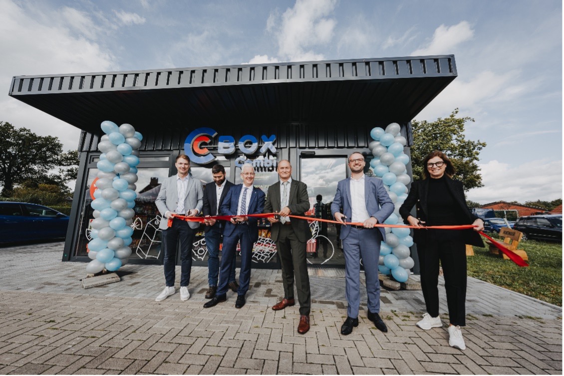 V.l.n.r.: Christian Oltmanns (Bünting Unternehmensgruppe), Christoph Busboom (Samtgemeindebürgermeister), Matthias Groote (Landrat Landkreis Leer), Udo Dänekas (Bürgermeister Nortmoor), Kevin Schröder (Projektmanager Bünting Unternehmensentwicklung) und Birgit Schröder (Leiterin Bünting Unternehmensentwicklung) bei der Eröffnung der cBox.